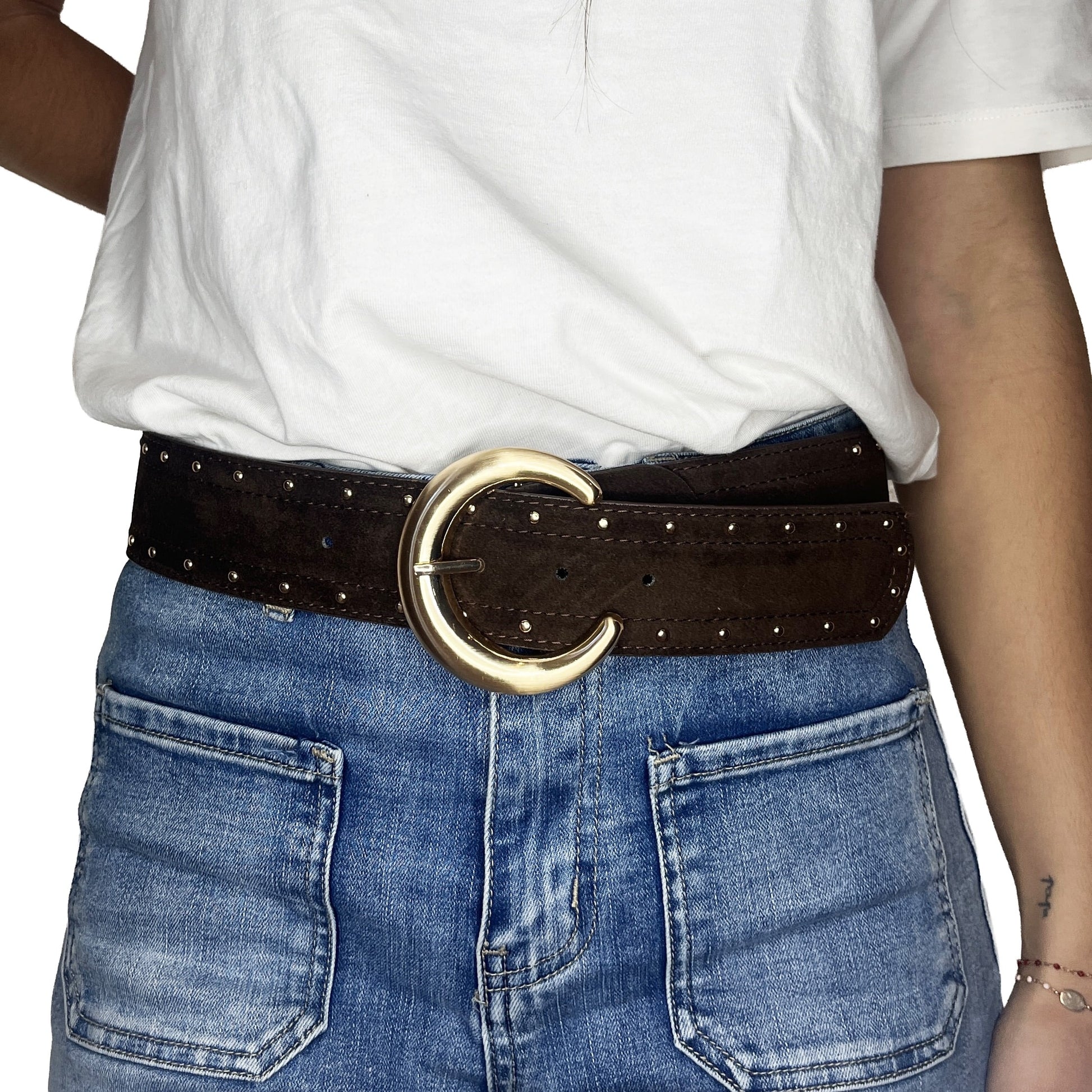 Misez sur le volume et l'éclat avec cette ceinture large effet suédine. Elle est ornée de petits clous dorés. Son point fort est sa boucle en forme arrondie (C), qui attire immédiatement le regard et structure la silhouette.