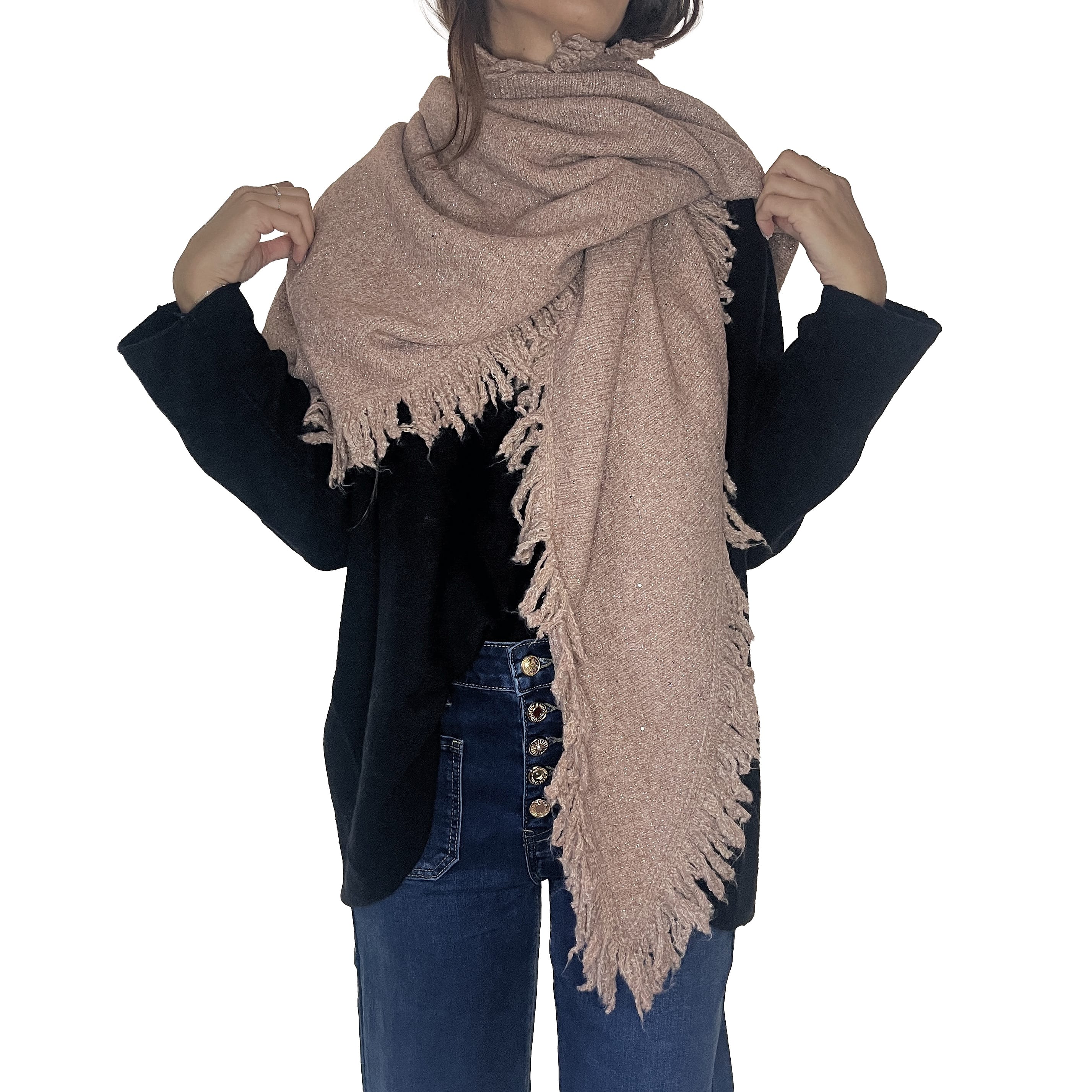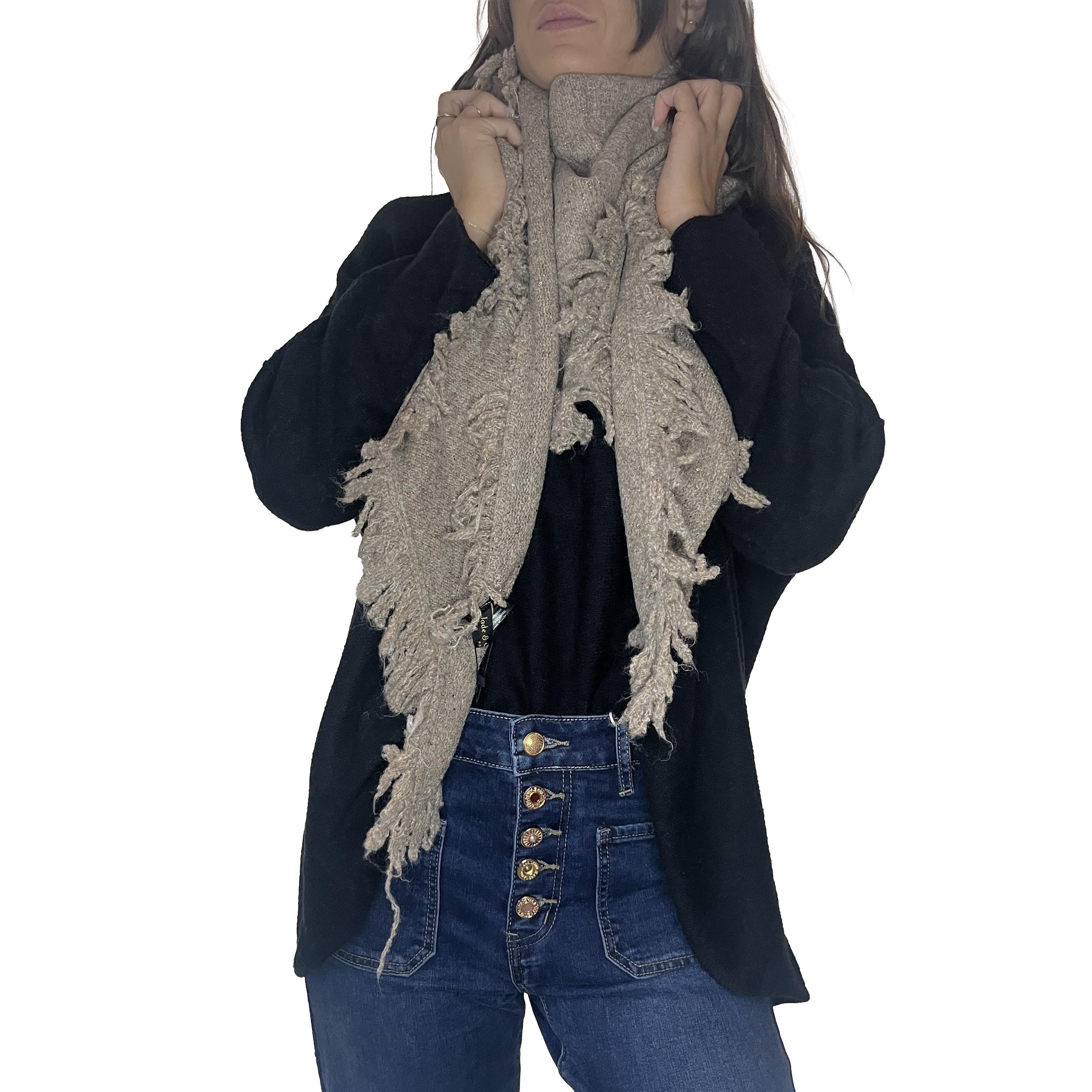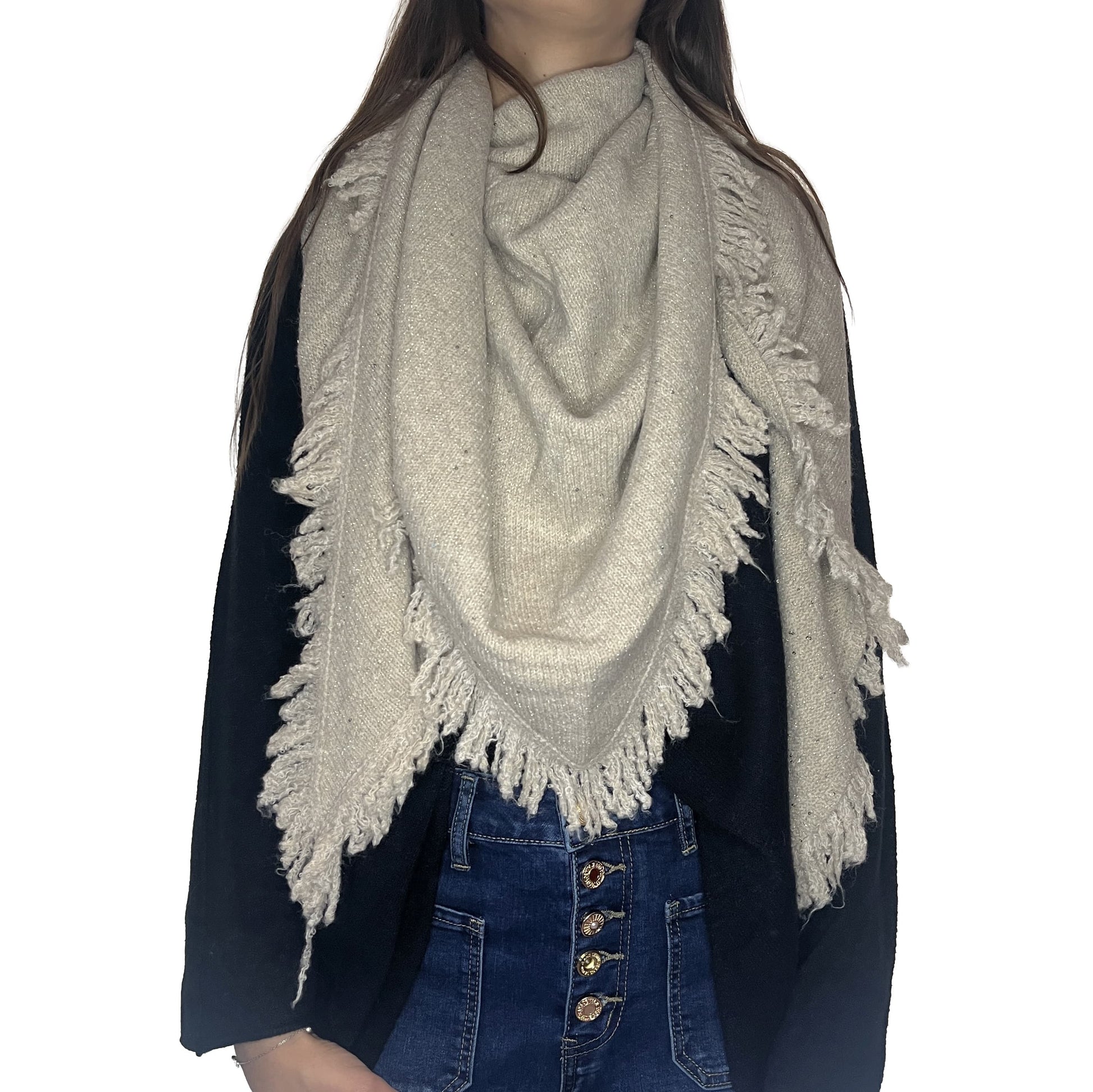 Ajoutez une touche de glamour discret à vos tenues avec ce magnifique châle. Sa maille est subtilement parsemée de paillettes scintillantes, parfait pour illuminer vos journées et vos soirées. La coupe triangulaire et les grandes franges lui confèrent un volume élégant, idéal pour être drapé sur vos épaules ou enroulé autour du cou. Un accessoire indispensable pour rester au chaud avec style.