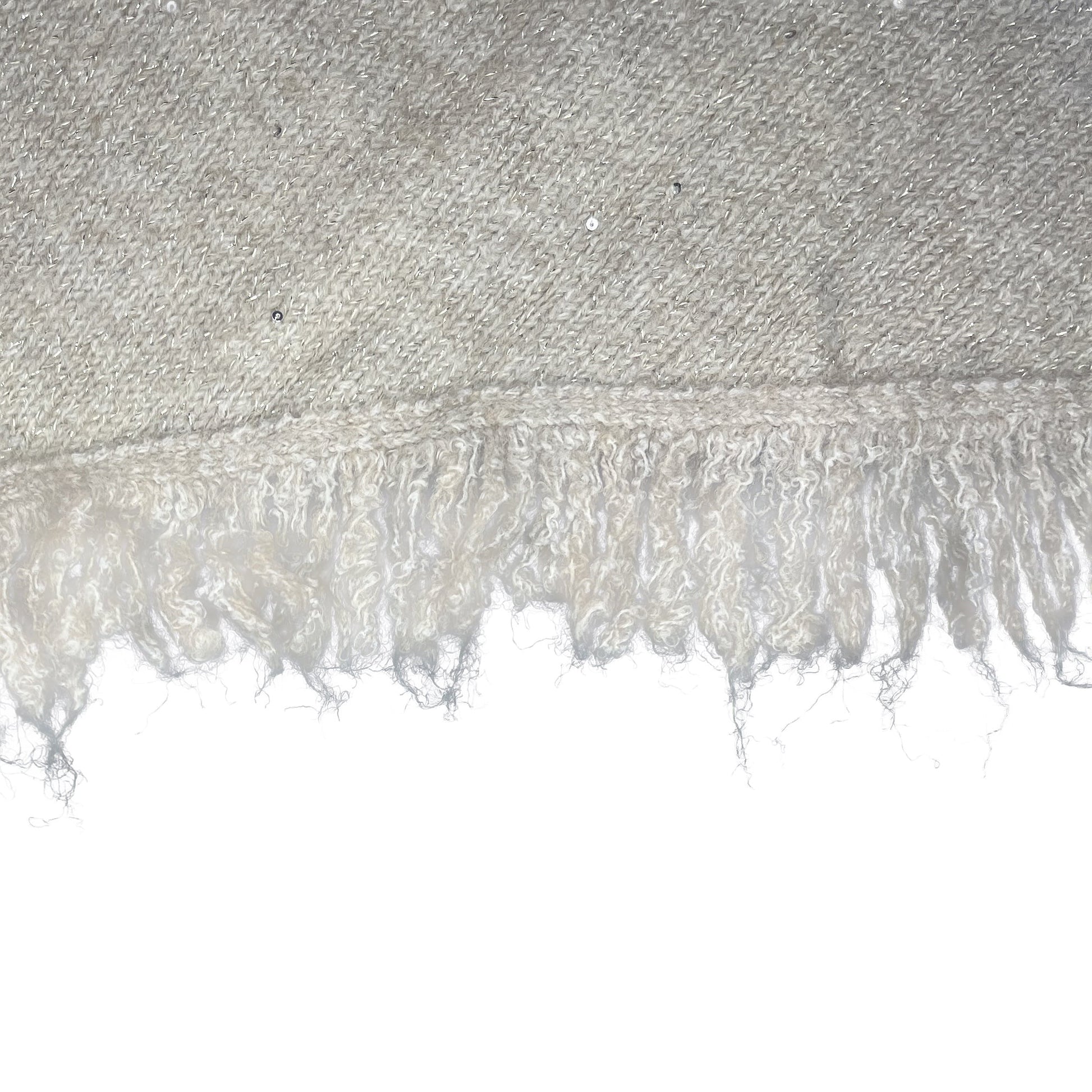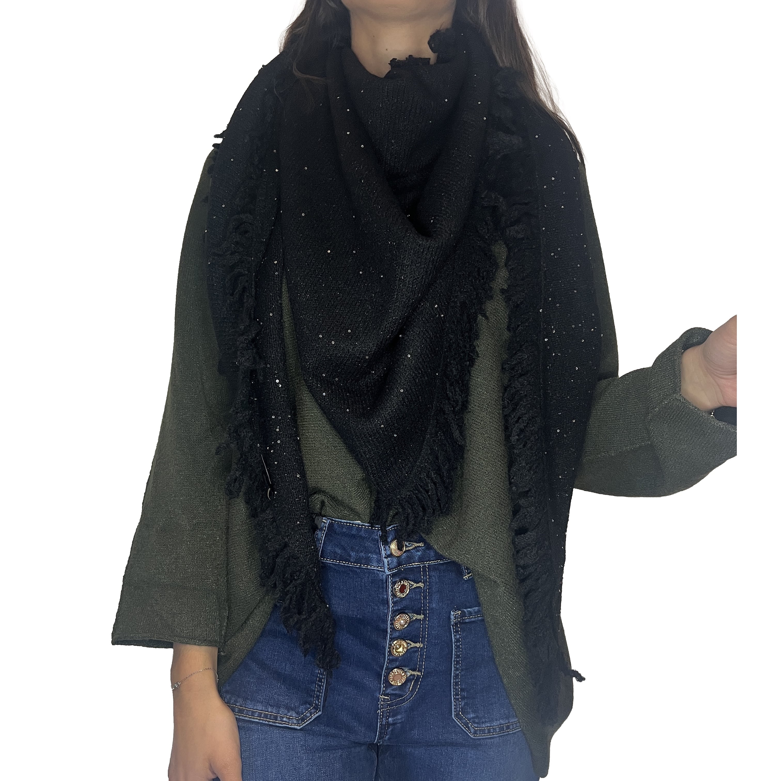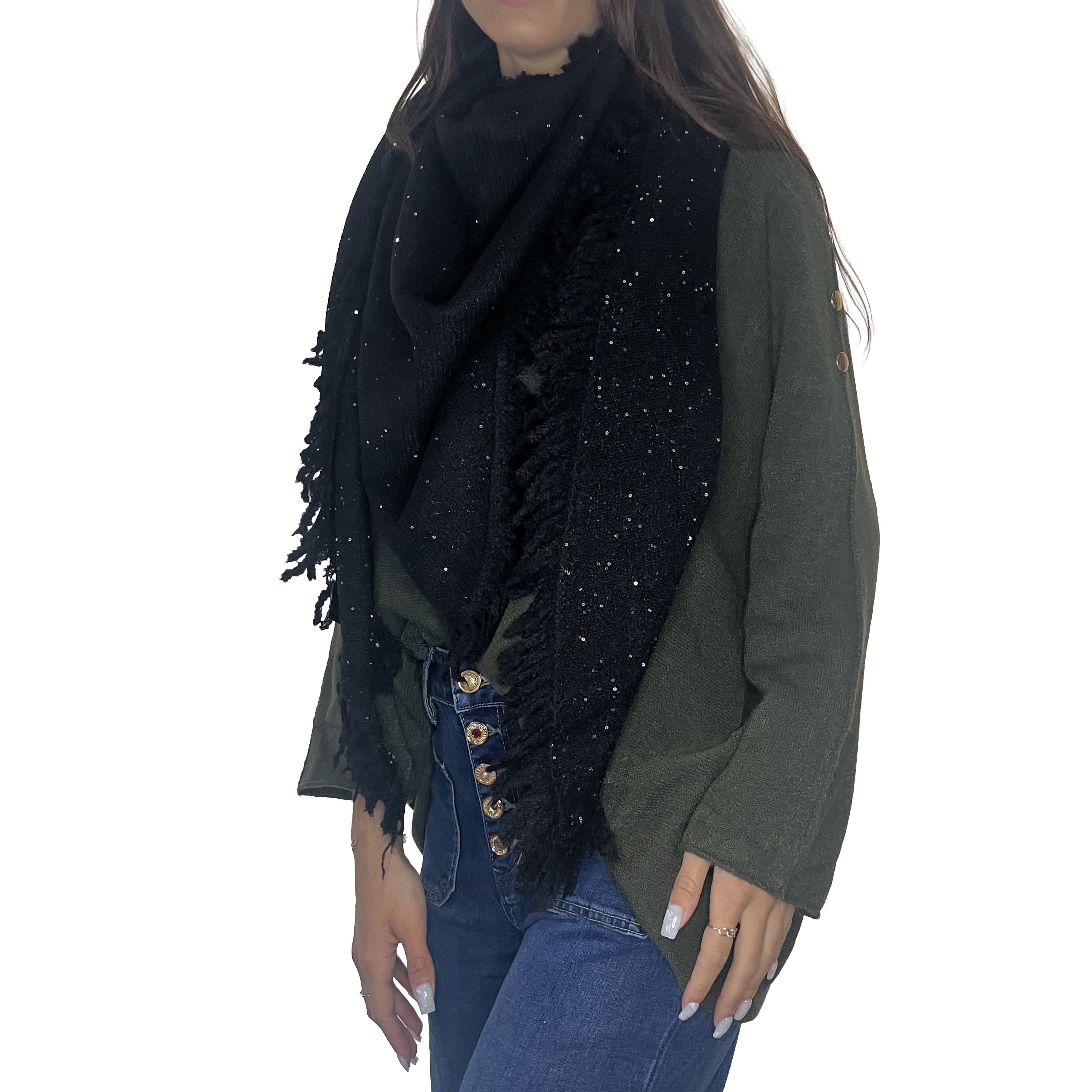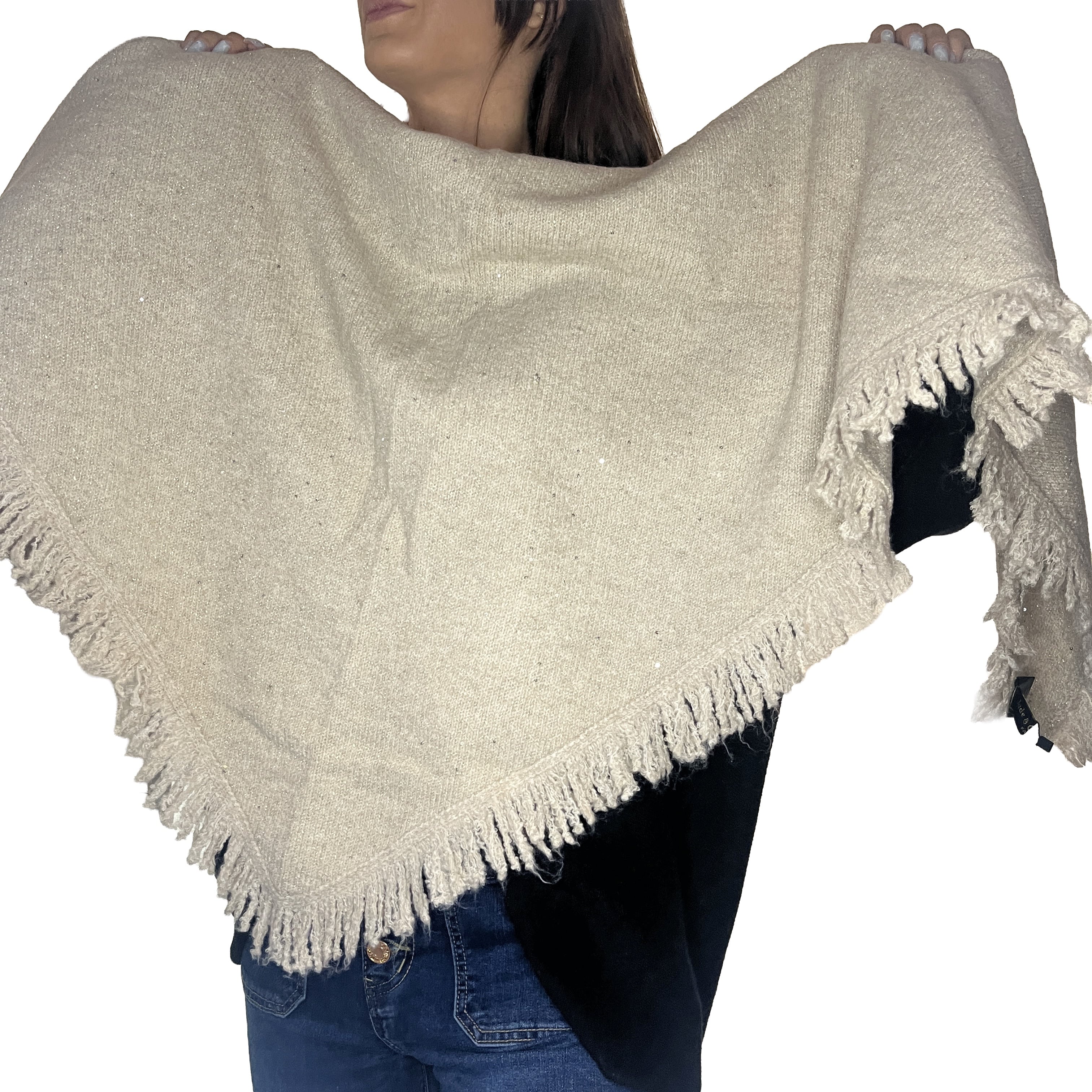 Ajoutez une touche de glamour discret à vos tenues avec ce magnifique châle. Sa maille est subtilement parsemée de paillettes scintillantes, parfait pour illuminer vos journées et vos soirées. La coupe triangulaire et les grandes franges lui confèrent un volume élégant, idéal pour être drapé sur vos épaules ou enroulé autour du cou. Un accessoire indispensable pour rester au chaud avec style.