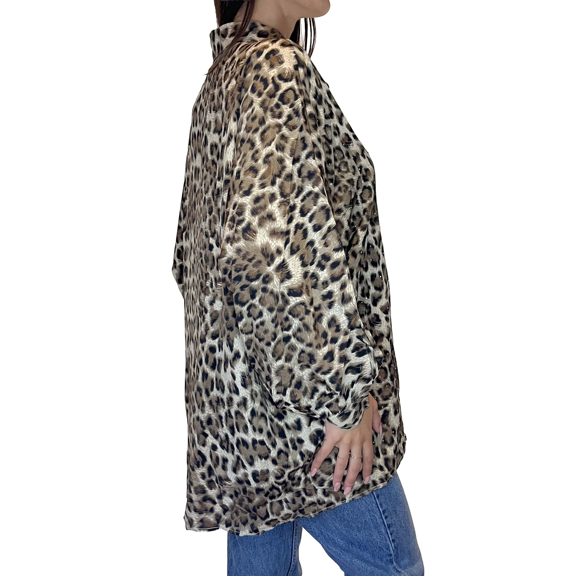 Chemise à imprimé léopard. Le tombé fluide du tissu assure une allure décontractée et chic. Les strass discrètement intégrés dans l'imprimé ajoutent une touche de lumière.