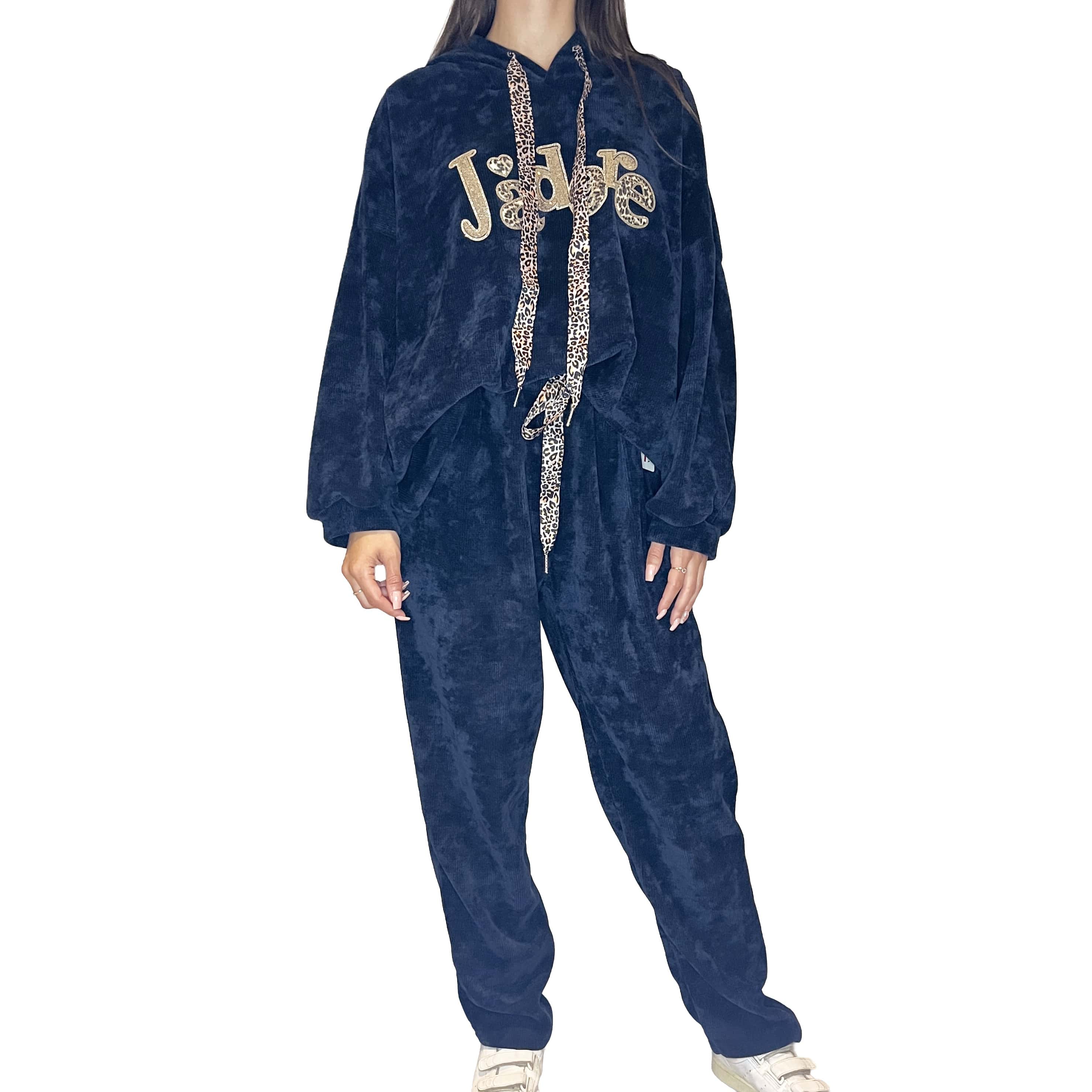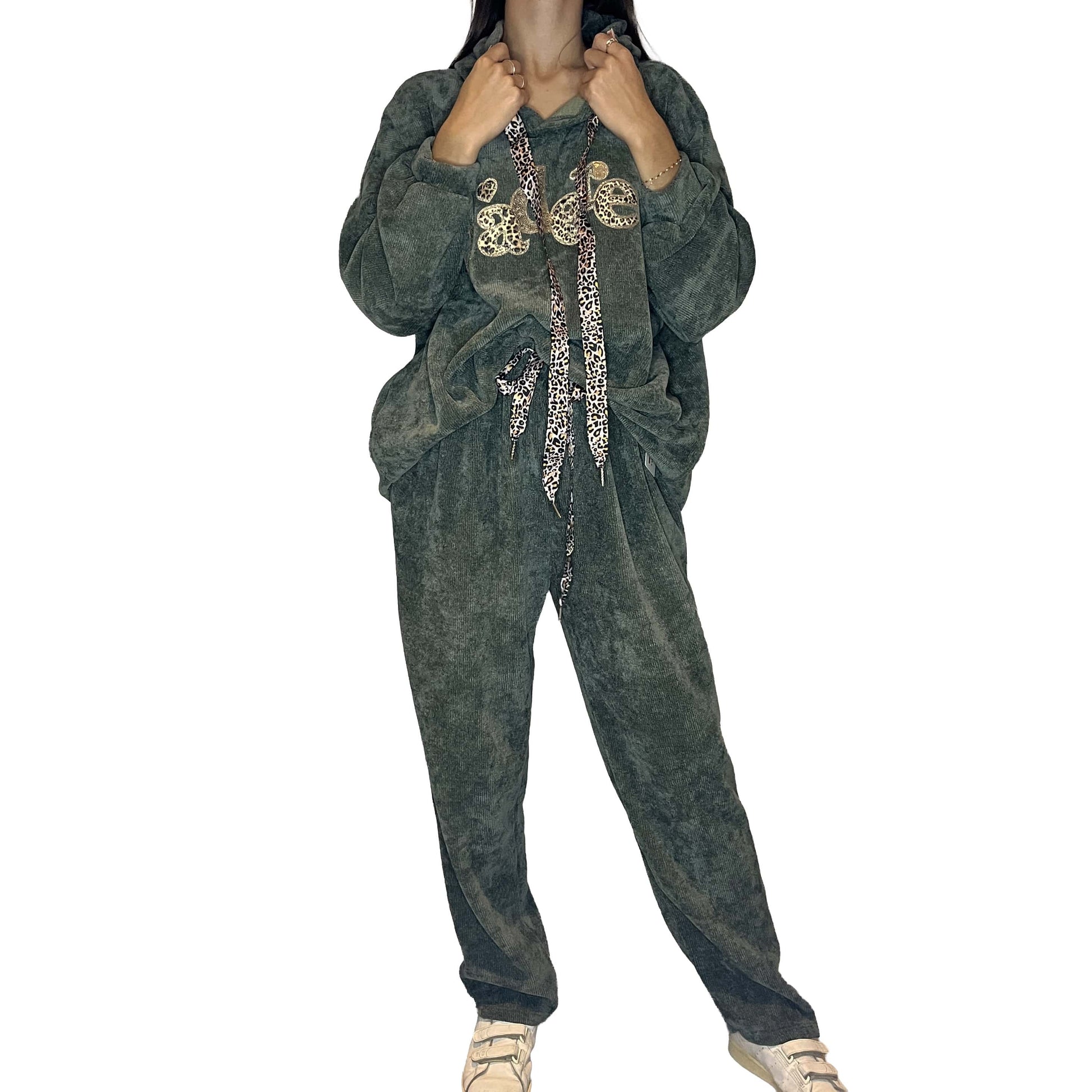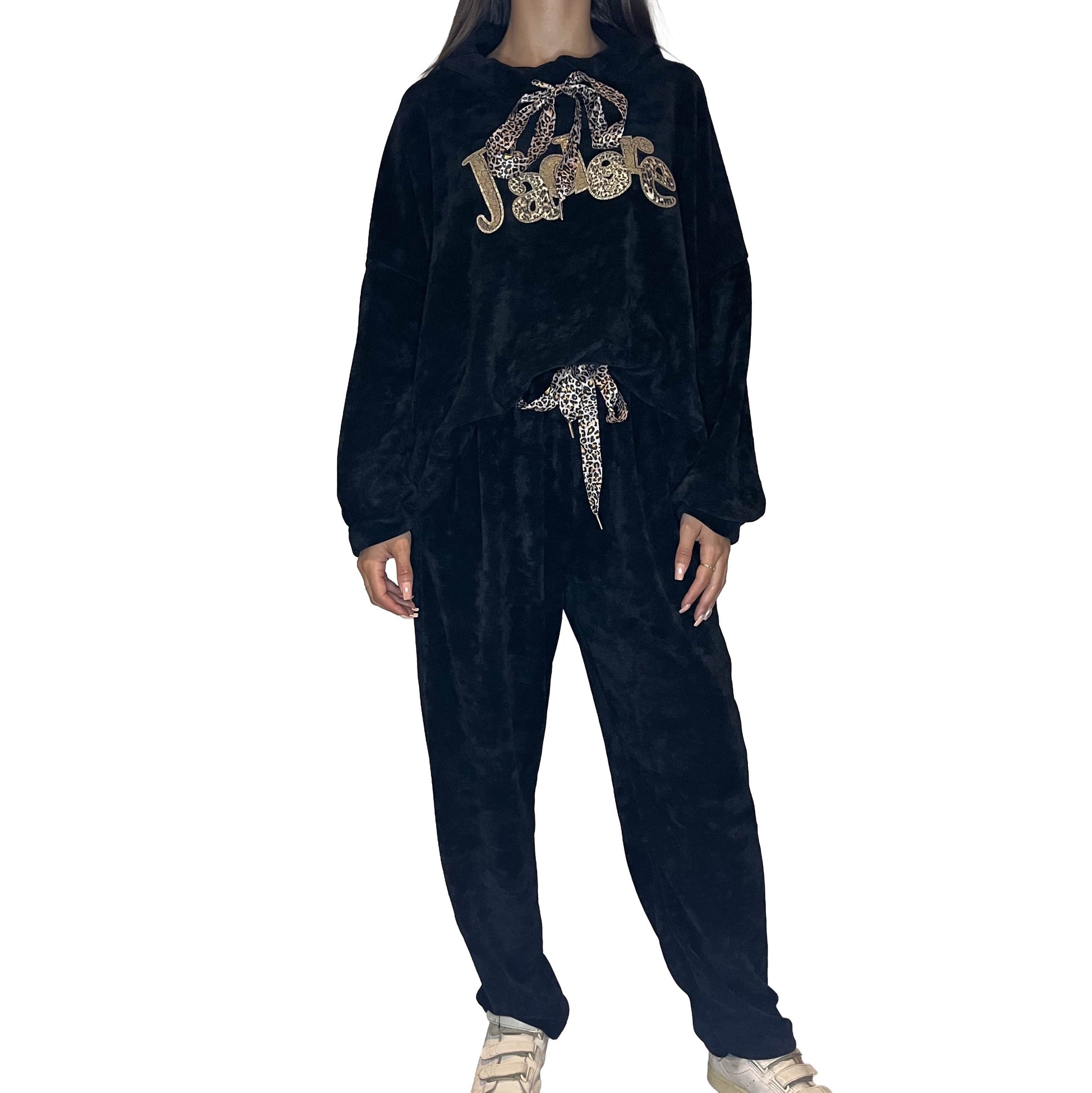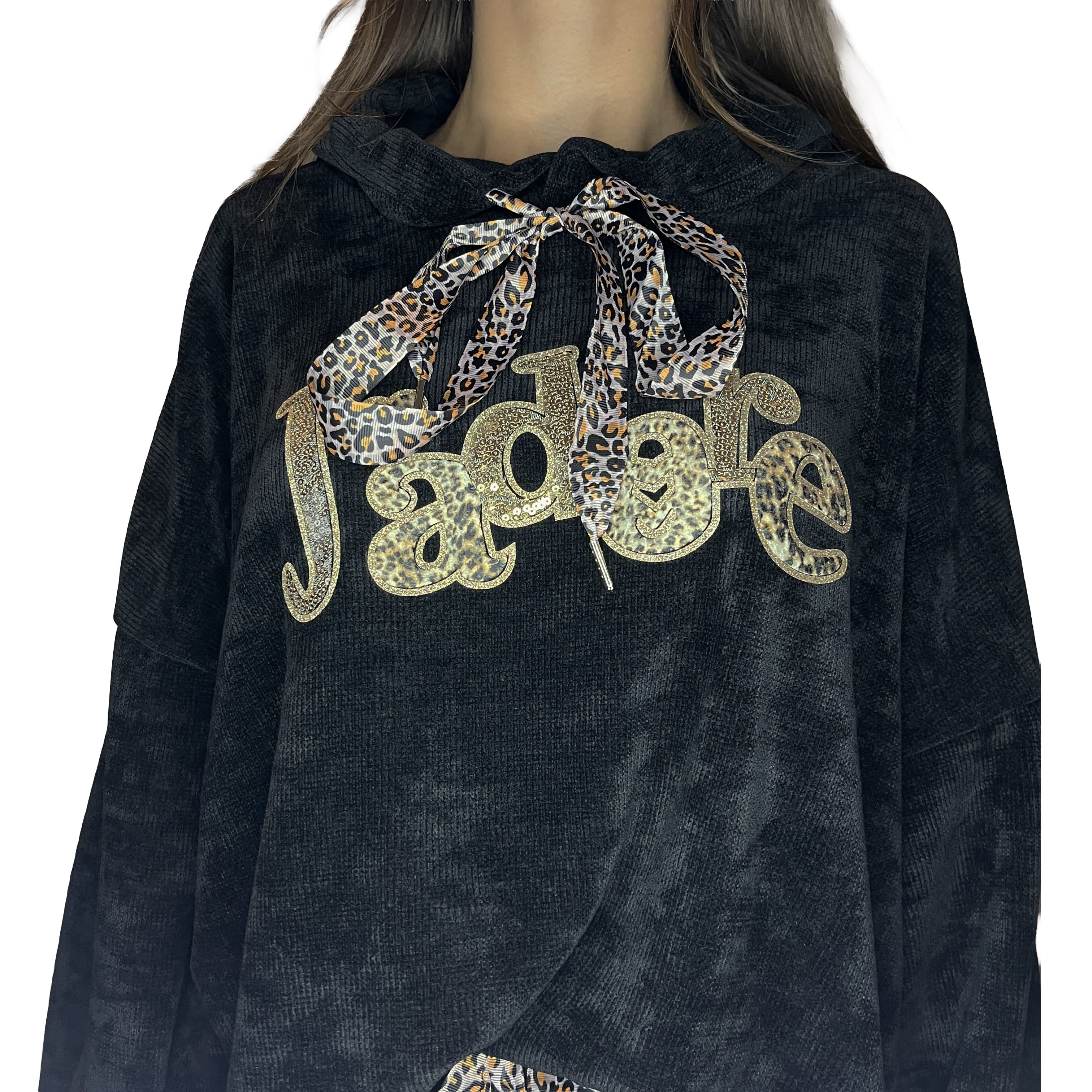 Ensemble cocooning “J’adore” avec effet velours côtelé. Confort absolu et style décontracté ! Cet ensemble en matière douce comprend un sweat à capuche oversize avec cordons imprimé léopard et un pantalon assorti à taille élastique avec une touche tendance.