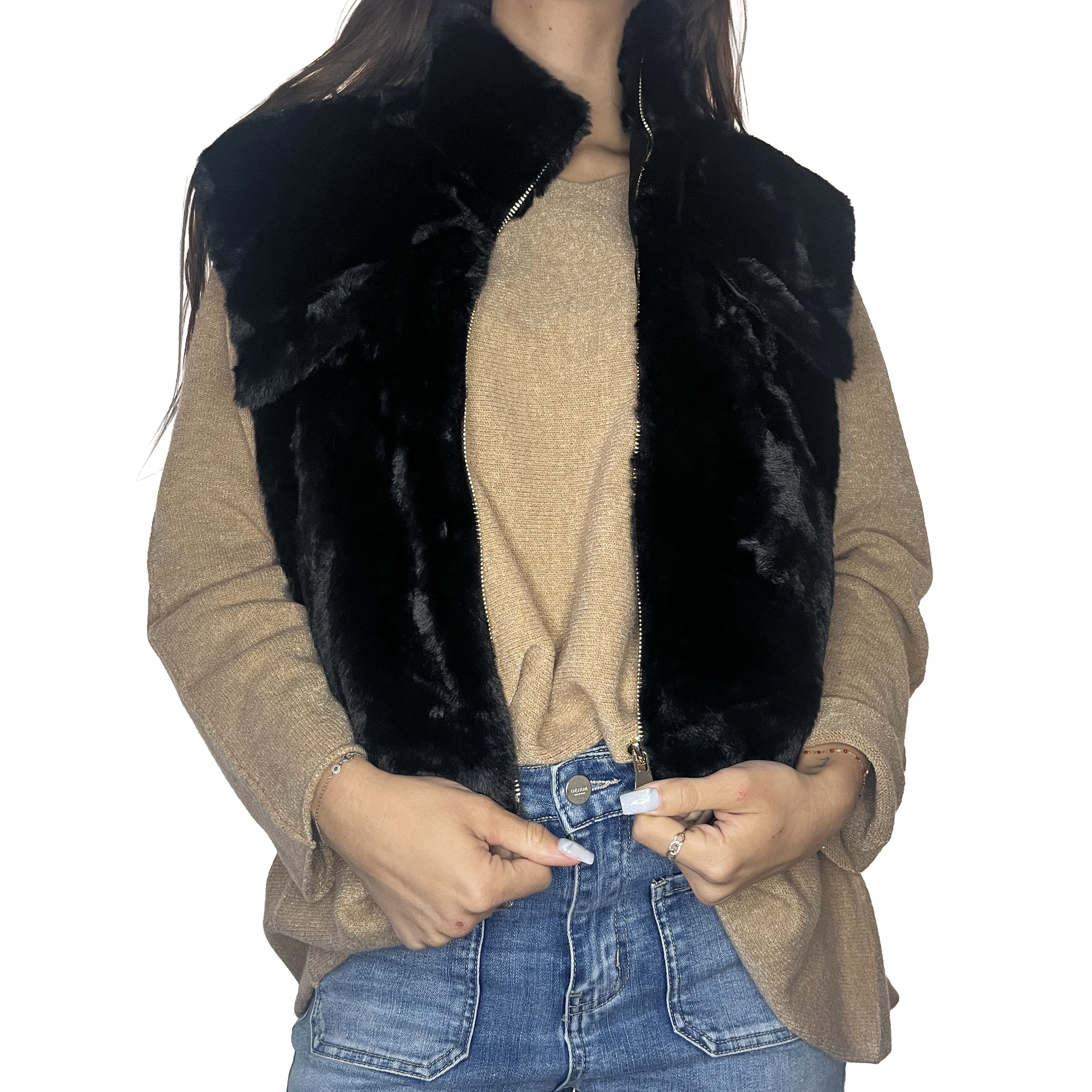 Ajoutez une touche de luxe et de chaleur à vos tenues avec ce gilet douillet ! Fausse fourrure dense et douce, idéale pour rester au chaud avec style. Col montant, fermeture éclair centrale et fausses poches poitrine. Gilet sans manches facile à superposer sur un pull fin ou un chemisier.