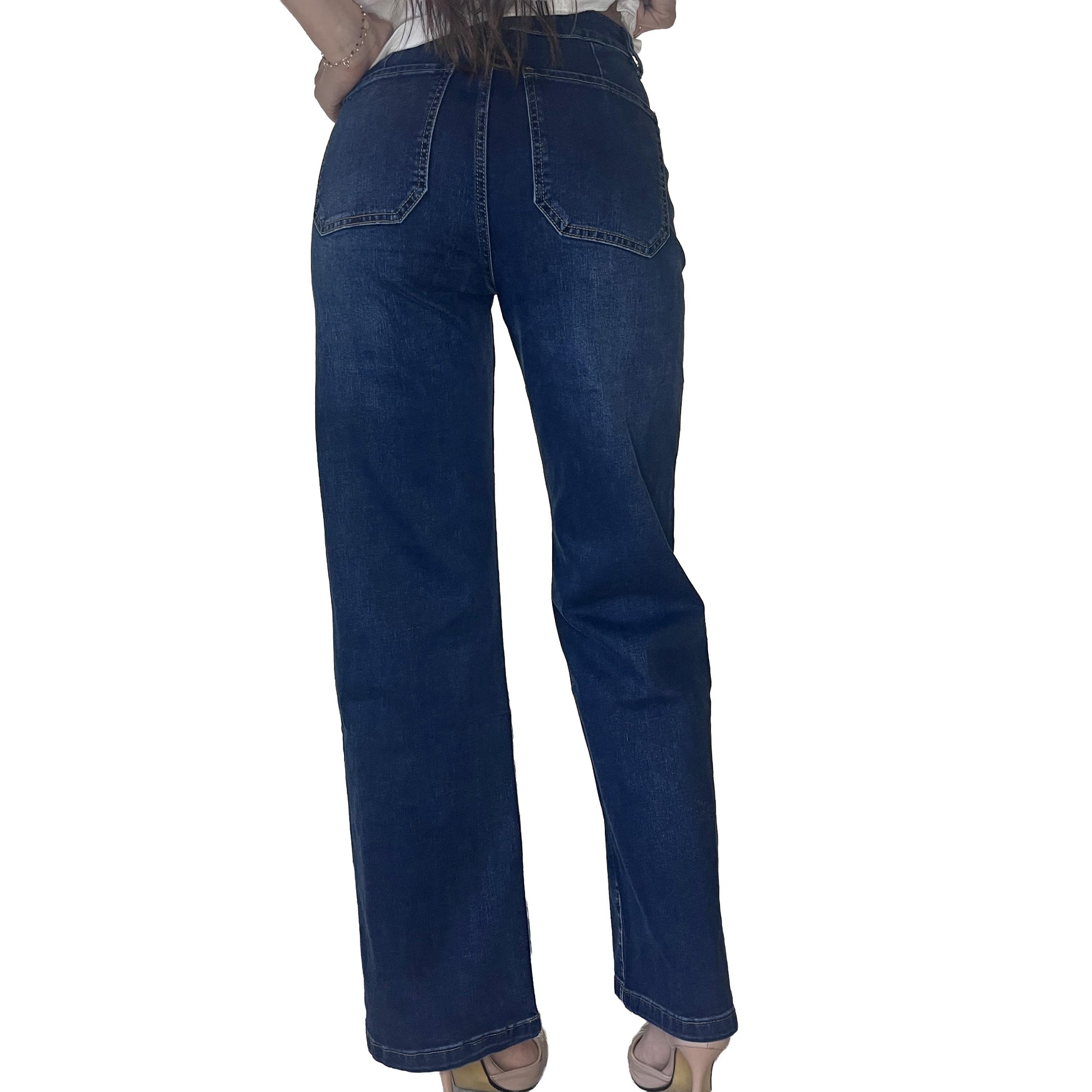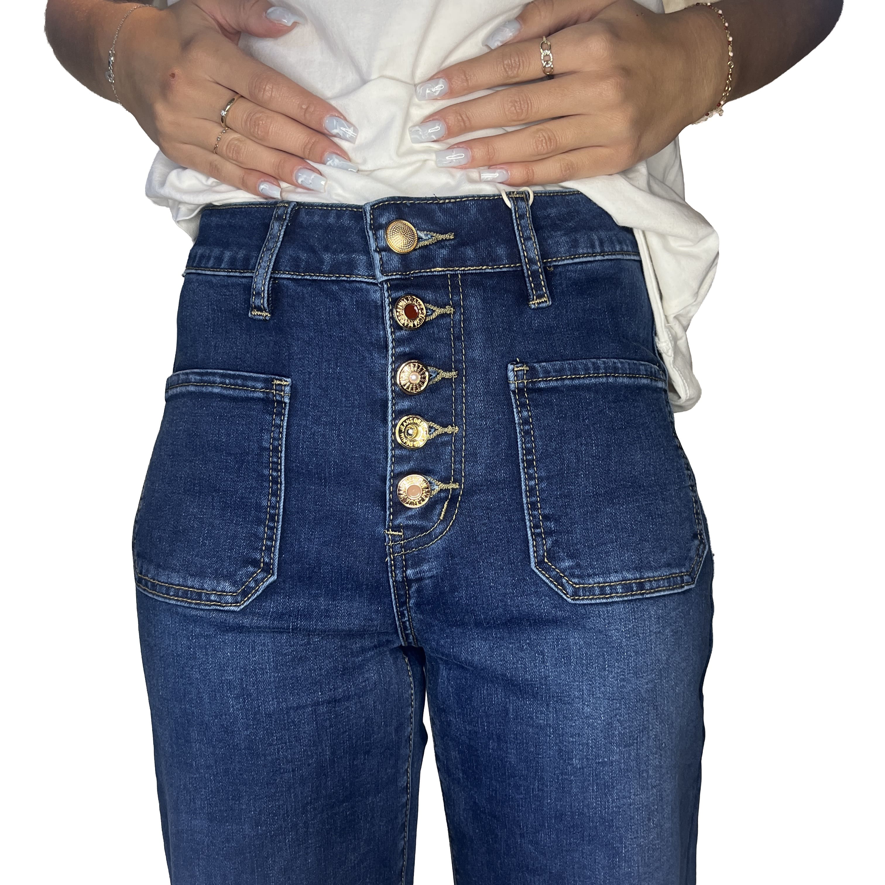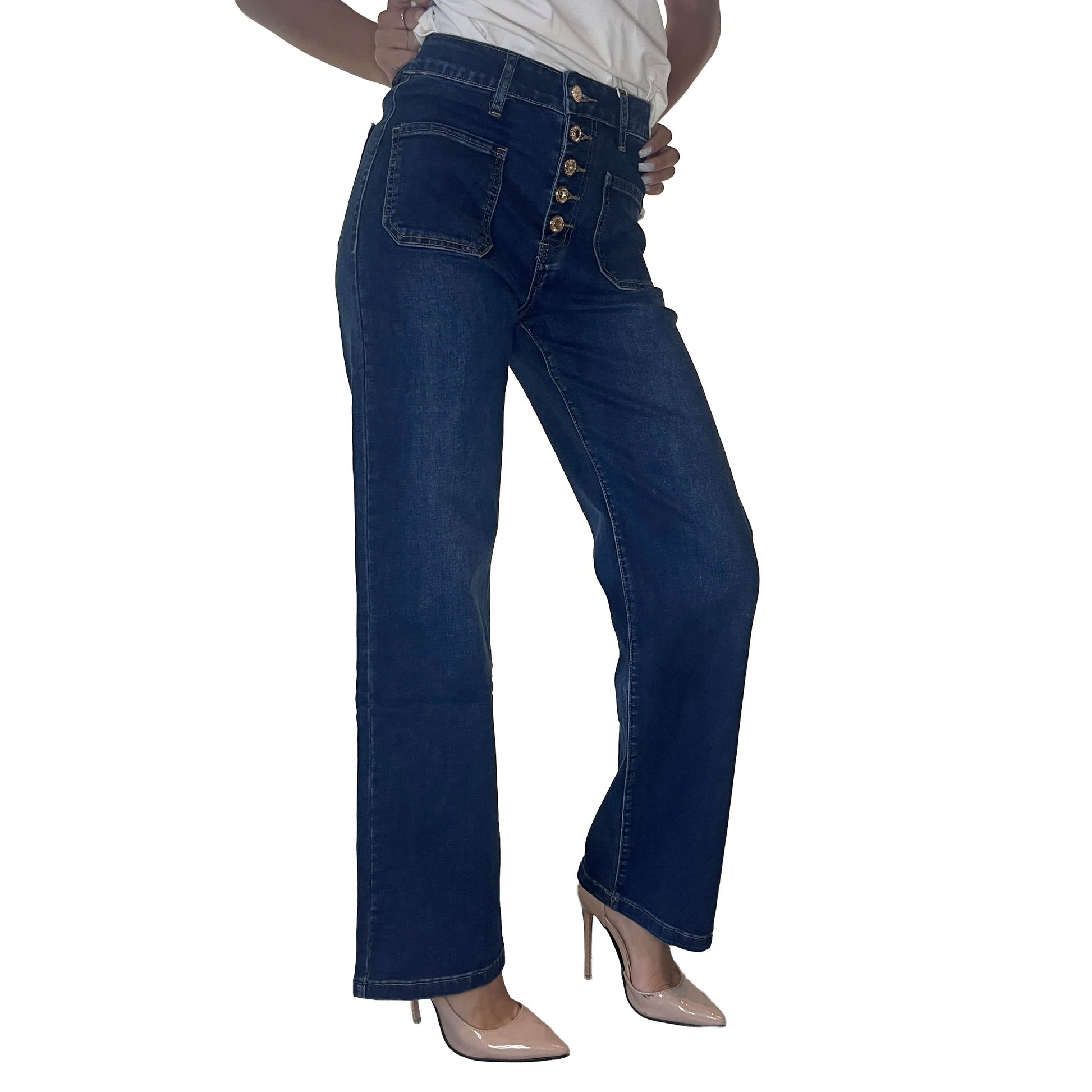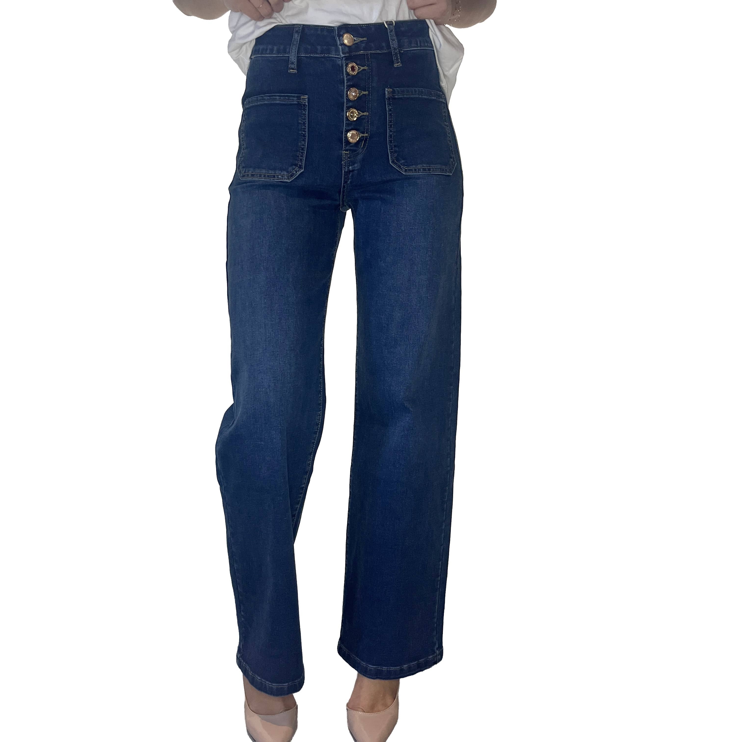 Un jean structuré d'inspiration marine pour une silhouette flatteuse ! Taille haute et jambe droite/large pour allonger la silhouette. Fermeture à boutons dorés apparents et grandes poches plaquées sur le devant.
