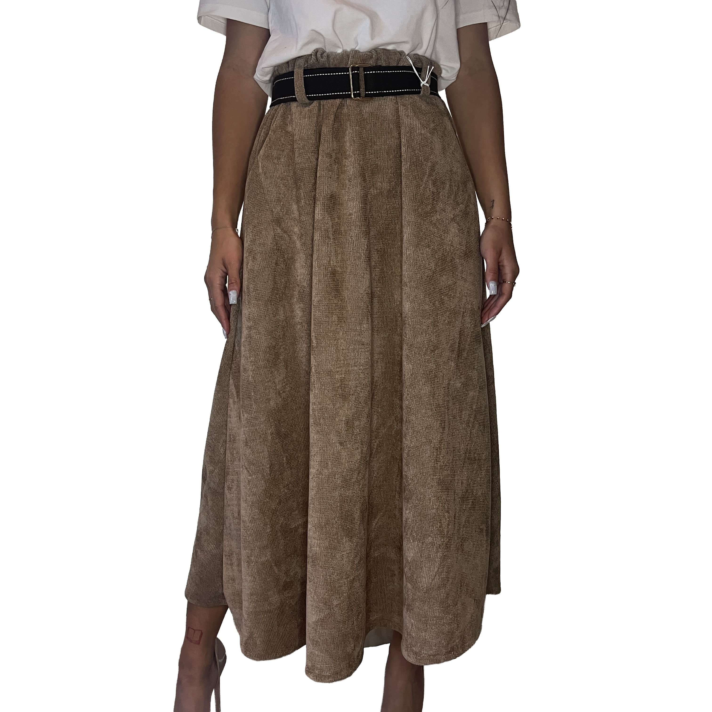 Une jupe longue texturée pour un look intemporel ! Effet velours côtelé fin, avec poches. Livrée avec une ceinture large marron et blanche pour marquer la taille. Idéale avec des bottes ou des talons, pour un style vintage ou sophistiqué.