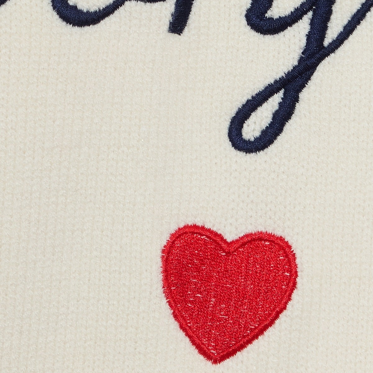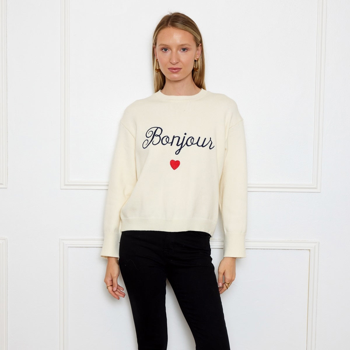 Un pull doux et plein de charme ! Inscription "Bonjour" brodée en marine avec un petit cœur rouge. Maille fine écru, douce et facile à porter. Un basique décontracté avec un message positif et élégant.