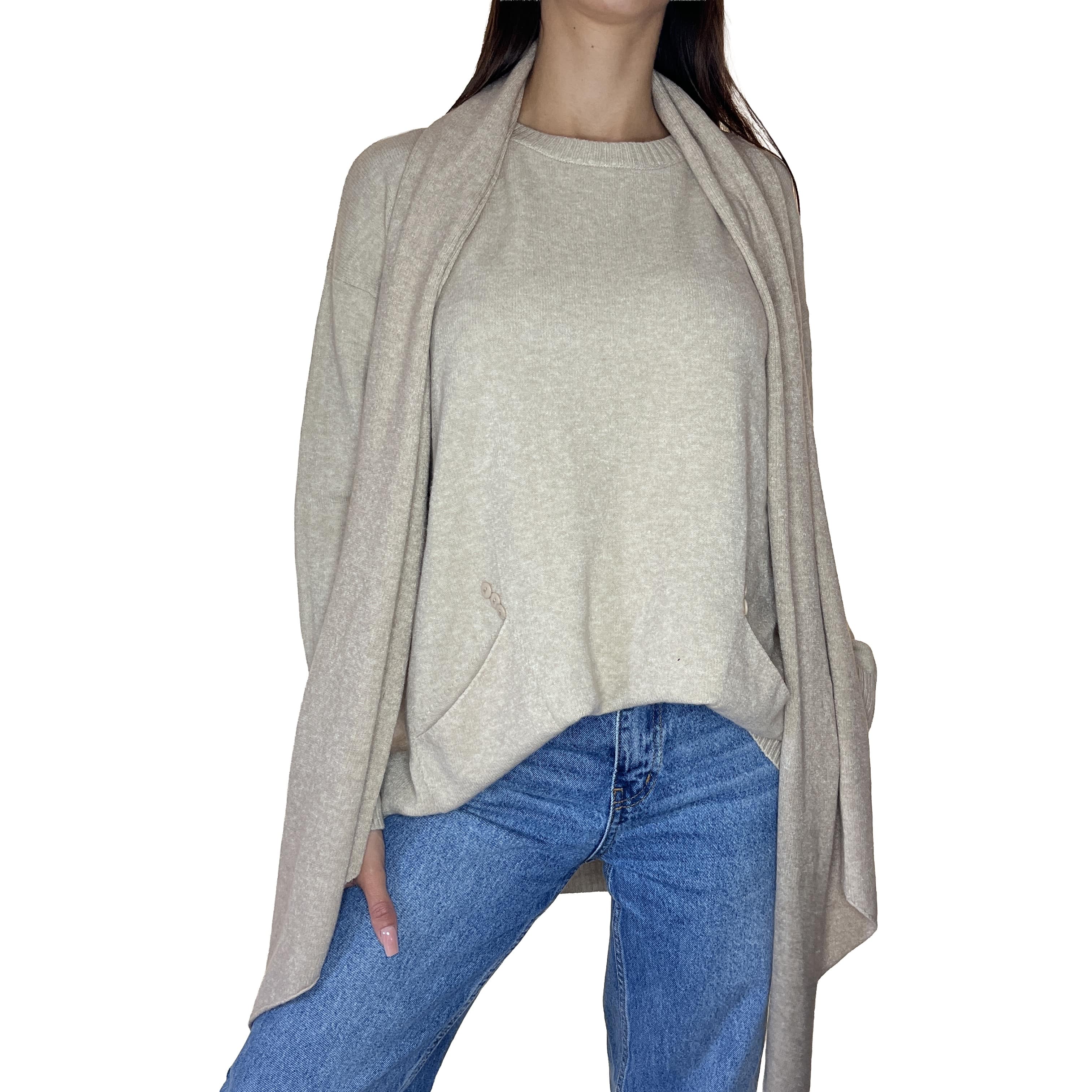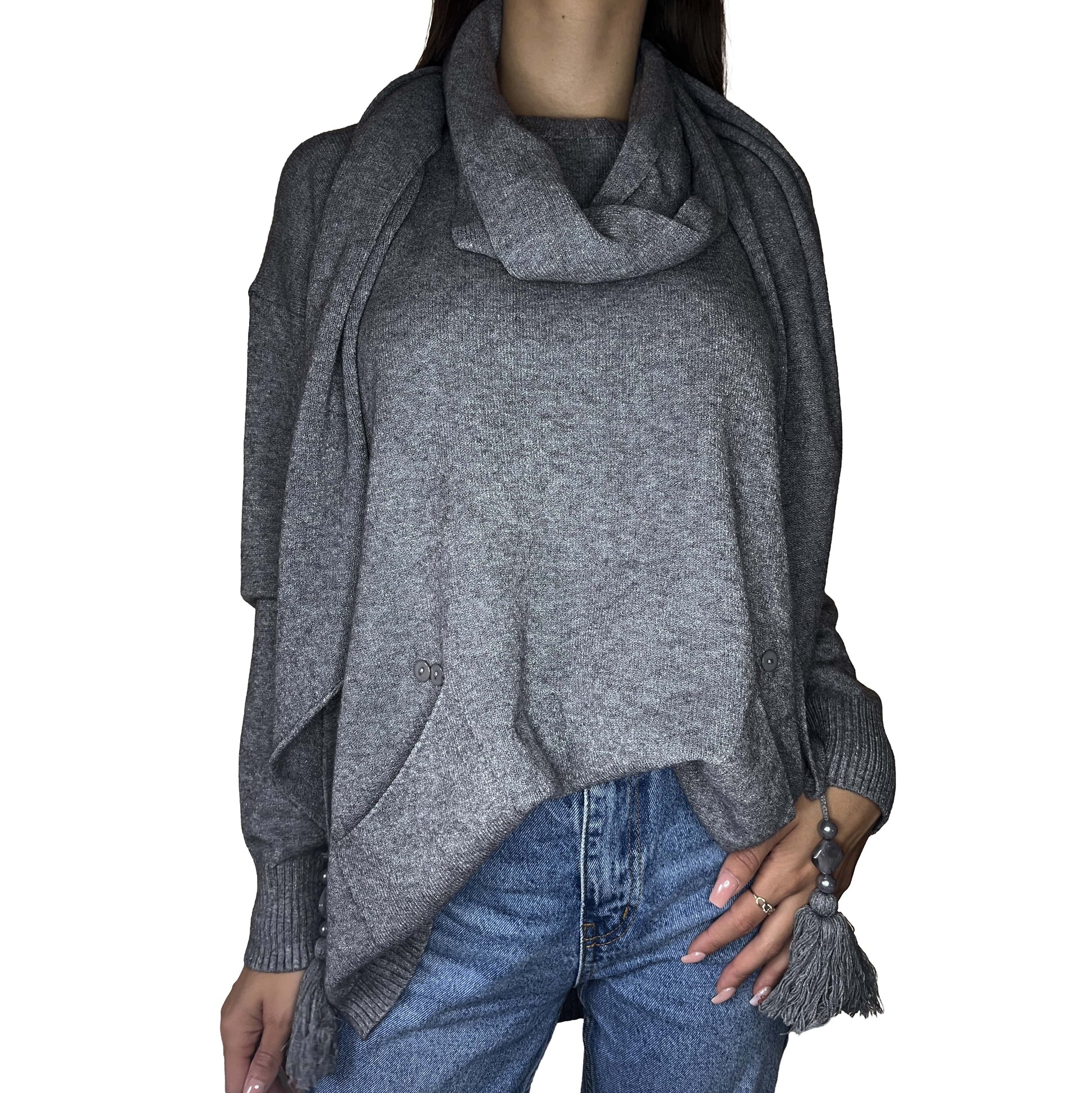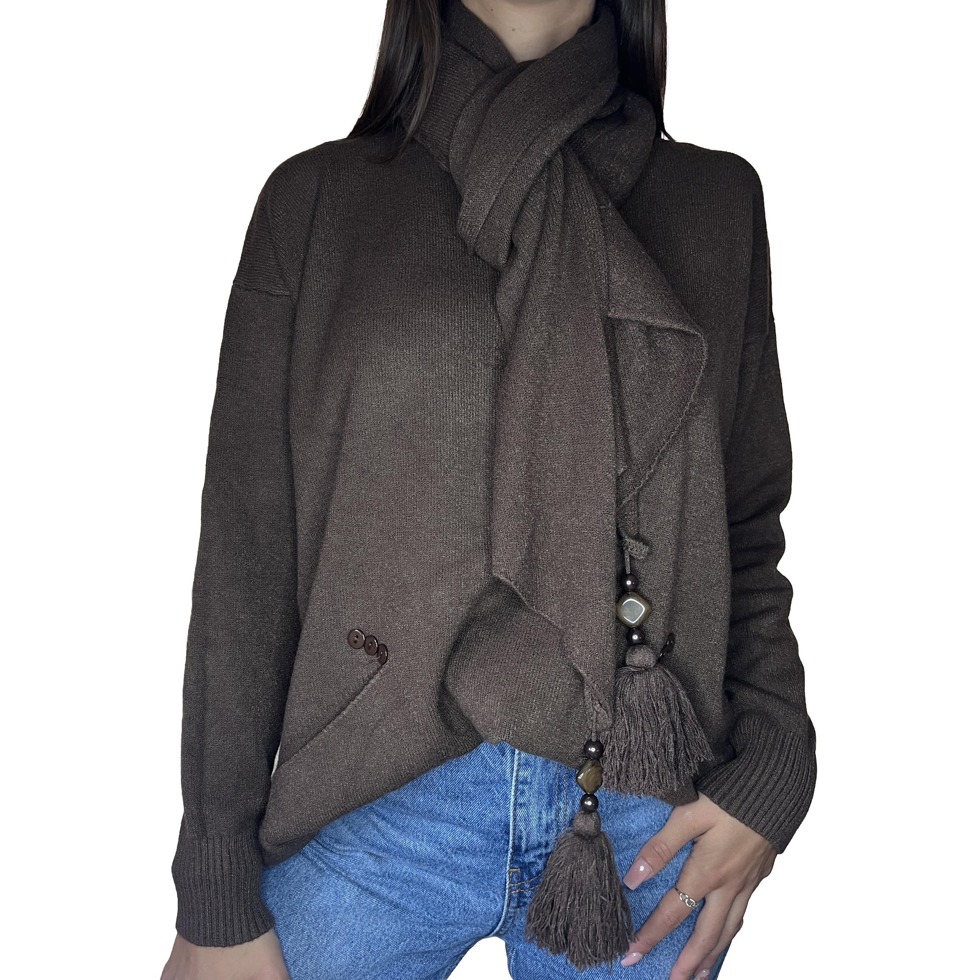 Ensemble pull et écharpe en maille. Chic, doux et confortable, cet ensemble comprend un pull en maille fine et son écharpe assortie ornée de pompons et perles décoratives. Idéal pour un look élégant au quotidien, il offre chaleur et style tout en restant léger et agréable à porter.