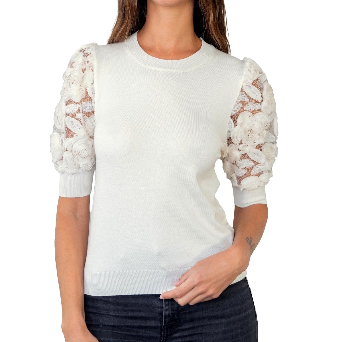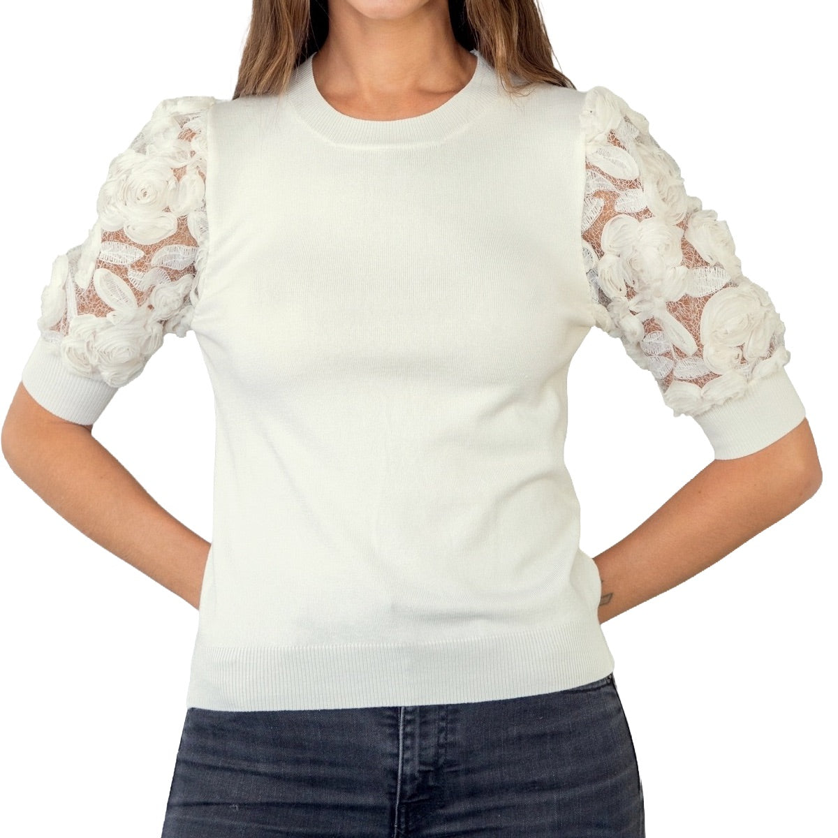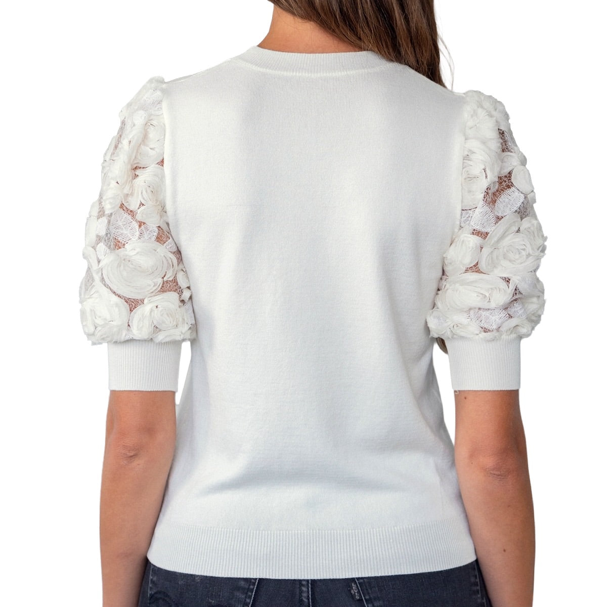 L'alliance romantique de la maille fine et du volume floral ! Pull manches courtes bouffantes ornées d'applications en dentelle florale 3D, apportant une touche de sophistication. Tricot fin et confortable. Coupe ajustée avec des manches volumineuses.